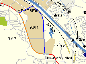 |  | 路線概略図 久里浜工業団地を通るバスは、一部区間の道路が未整備であったため開通後しばらく迂回運転をしていました。図のオレンジ色の部分が工事中の区間で、青い部分が迂回区間です。久里浜駅から来ると迂回区間に入りすぐ茅山というバス停があったと思うのですが、迂回期間が短かったため良く覚えていません。 |