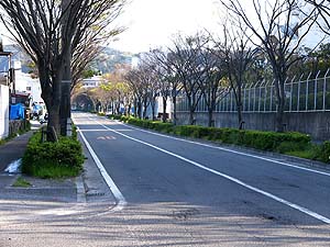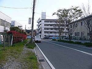 |  | 上の交差点を左折したところ。歩道のついた道路になっています。一時的とはいえバスが通るので歩道をちゃんと整備したのか、ちゃんと整備してあるから迂回してまで開業したのか。 |