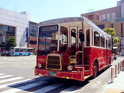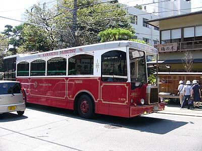 京急りんどう号路線概略 運転区間 鎌倉駅〜大仏前(各停留所停車) 運転距離 2.1km 運転本数 平日12往復、土曜休日13往復 運転開始 1992年11月28日 運転車両 C3274 日野U-CG3KSAU(東京特殊車体) 1992年11月28日に京急りんどう号として2両の車両(C3274,C3275)を持って鎌倉駅〜大仏前、 鎌倉駅〜大塔宮に運転を開始しました。 レトロ調の特殊な車体と内装が話題になりましたが、その特殊性ゆえに運用および整備に難点が 多く、更に行楽地故に道路渋滞が激しく公示したダイヤ通りに運行できないことも多く、現在では 物珍しさも無くなり、特殊な形をした普通の路線バスといった存在でしかありません。鎌倉駅〜大塔宮の 運行を取りやめたあとも鎌倉駅〜大仏前の路線で運行されていますが、まもなく運行が終了に なります。(2006.9.24の運行をもって廃止になりました。) |