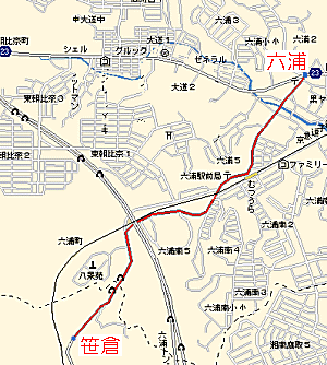 |  | 路線概略図 この路線は昭和35年9月1日に逗子駅−六浦−金沢八景線として運行開始されたが、京急逗子線と平行路線であり尚且つ電車が約10分毎に運行されていたこと、駅周辺以外は人家も少ないと言う状況で、昭和46年11月6日には特に利用者の少ない笹倉〜金沢八景間が廃止になってしまいました。 その後笹倉線(逗子駅〜笹倉)も逗子高校の通学や沿線住民の足として運行されましたが、乗客減少は続き一時は中型車の投入など改善策を模索しましたが、平成13年6月1日にアザリエ方面への路線が開設されたときにアザリエ線の経由地になっています。一方廃止された笹倉〜六浦は道路状況は かなり改善されたものの笹倉〜池子トンネルなどは廃止時と恐らく変ってない状況(建物がほとんどない)です。今回は笹倉〜六浦まで歩いてみました。 |