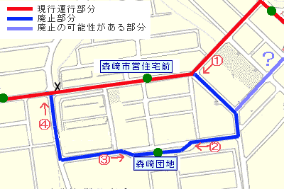 |  | 現在の森崎市営住宅前停留所。森崎団地停留所とは近いかったので、停留所廃止でも影響は軽微だったのかもしれません。 |