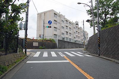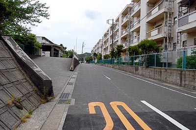 |  | 写真2 バスはこのスロープを上がり終点の森崎団地になりました。この停留所は半ば日産従業員のための停留所だったようです。バス用にスロープの勾配が緩めなのでしょうか。 |